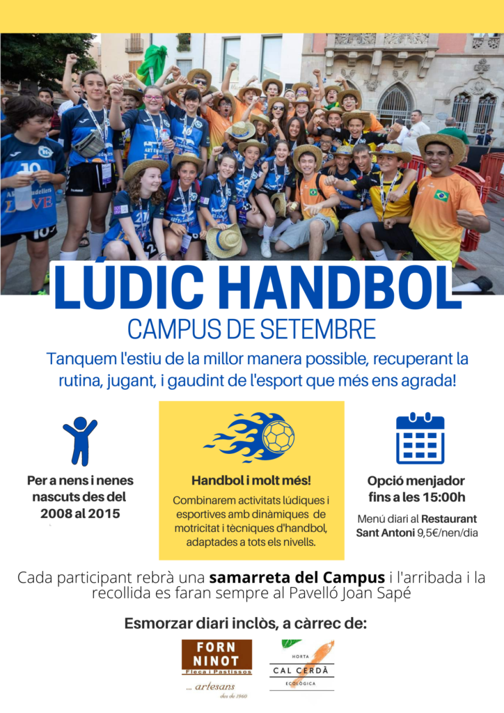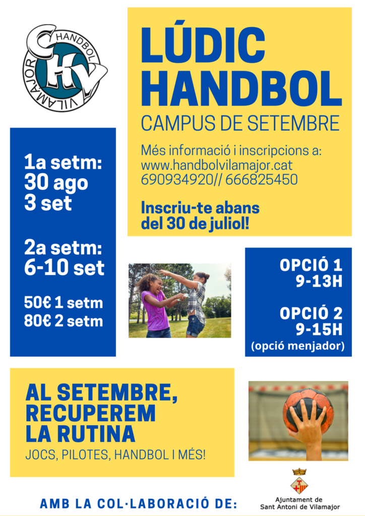 El Club Handbol Vilamajor organitzem un Campus de setembre per ajudar a recuperar la rutina abans de l’escola. Combinarem activitats lúdiques i esportives amb dinàmiques de motricitat i tècniques d’handbol adaptades a tots els nivells.
